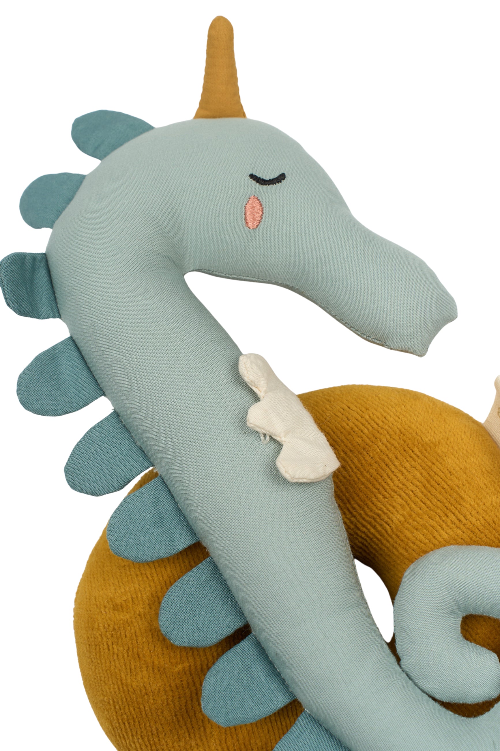 Diese Seepferdchen-Rassel ist aus samtiger Bio-Baumwolle gefertigt und bietet eine weiche, taktile Textur, die es deinem Baby ermöglicht, verschiedene Empfindungen zu erkunden. Der sanfte Rasselton, der durch das interne Rasselteil erzeugt wird, bietet auditive Stimulation und fördert die sensorische Entwicklung deines Babys.
