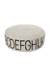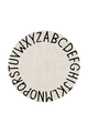 Dieser runde Pouf ist aus natürlichen Materialien gefertigt und zeigt das Alphabet in Schwarz auf einem natürlichen Untergrund. Die weiche Teppichoberfläche sorgt für Komfort, während die Unterseite aus Baumwoll-Canvas für Stabilität sorgt. Der Pouf ist mit einem Reißverschluss versehen und enthält eine herausnehmbare Füllung aus Polystyrolperlen.
