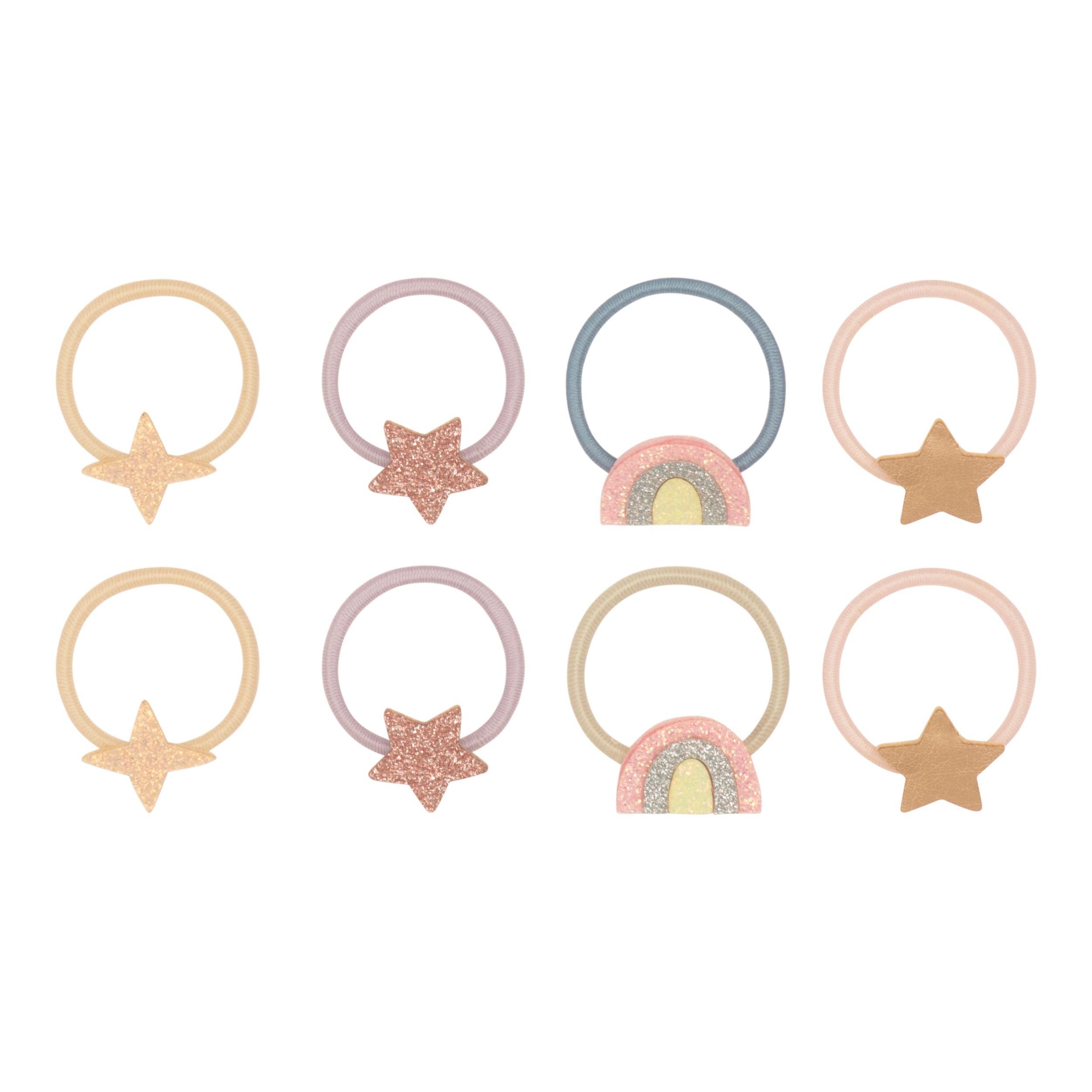 These charming mini pony ties from Mimi & Lula add shimmer and sparkle to everyday styles. With 8 pieces in a pack and 3cm stretchy, strong elastics in pretty pastel shades, they are perfect for little fashion enthusiasts. The pony ties are adorned with padded stars and rainbows crafted from twinkling glitter and metallic fabrics.