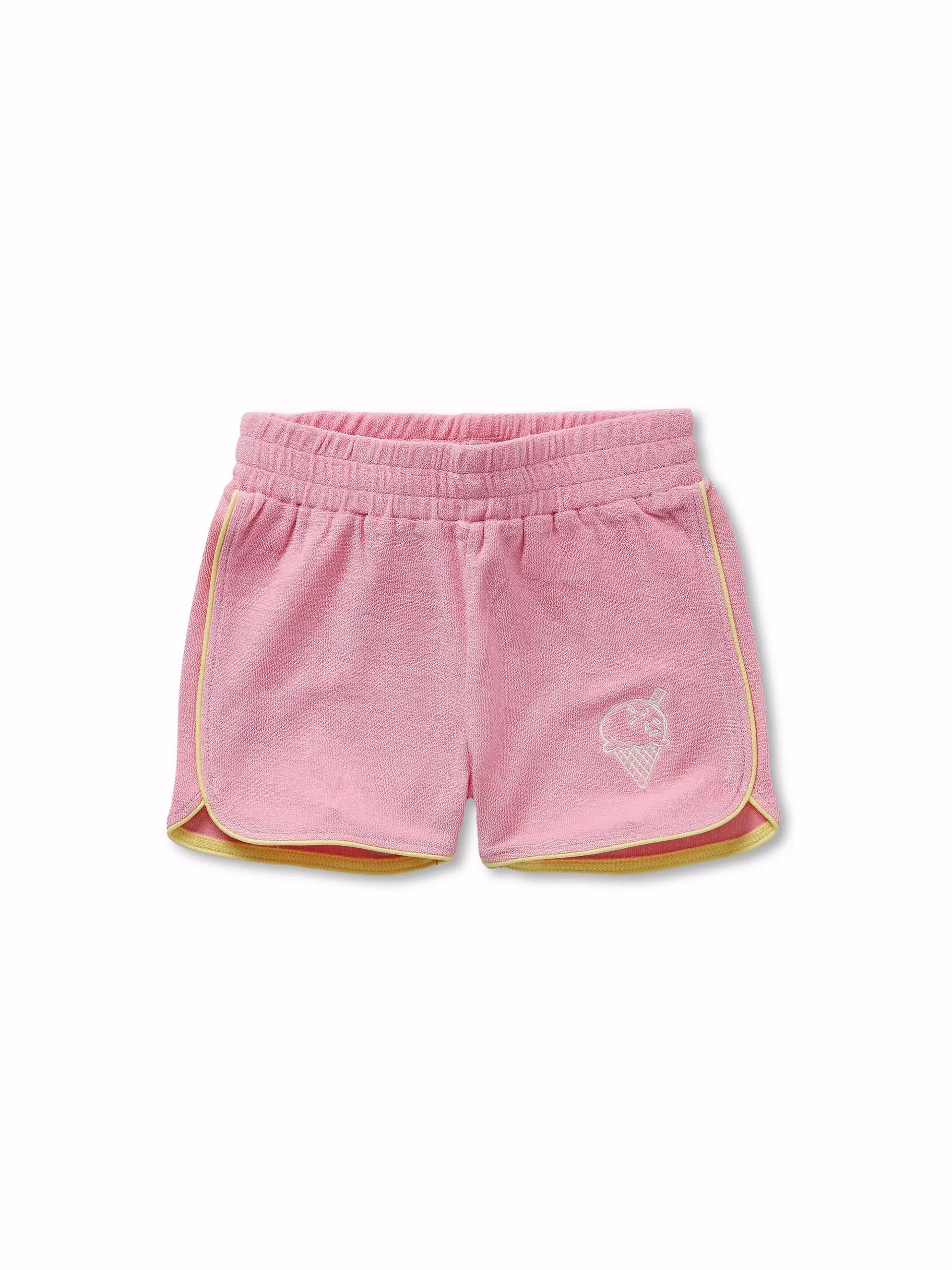 These sporty kids' shorts are crafted from 100% organic cotton terry, offering a soft and breathable option for active summer days. The shorts feature a vibrant podium pink color with sunny yellow piping and an embroidered ice cream motif, adding a sweet and playful touch.