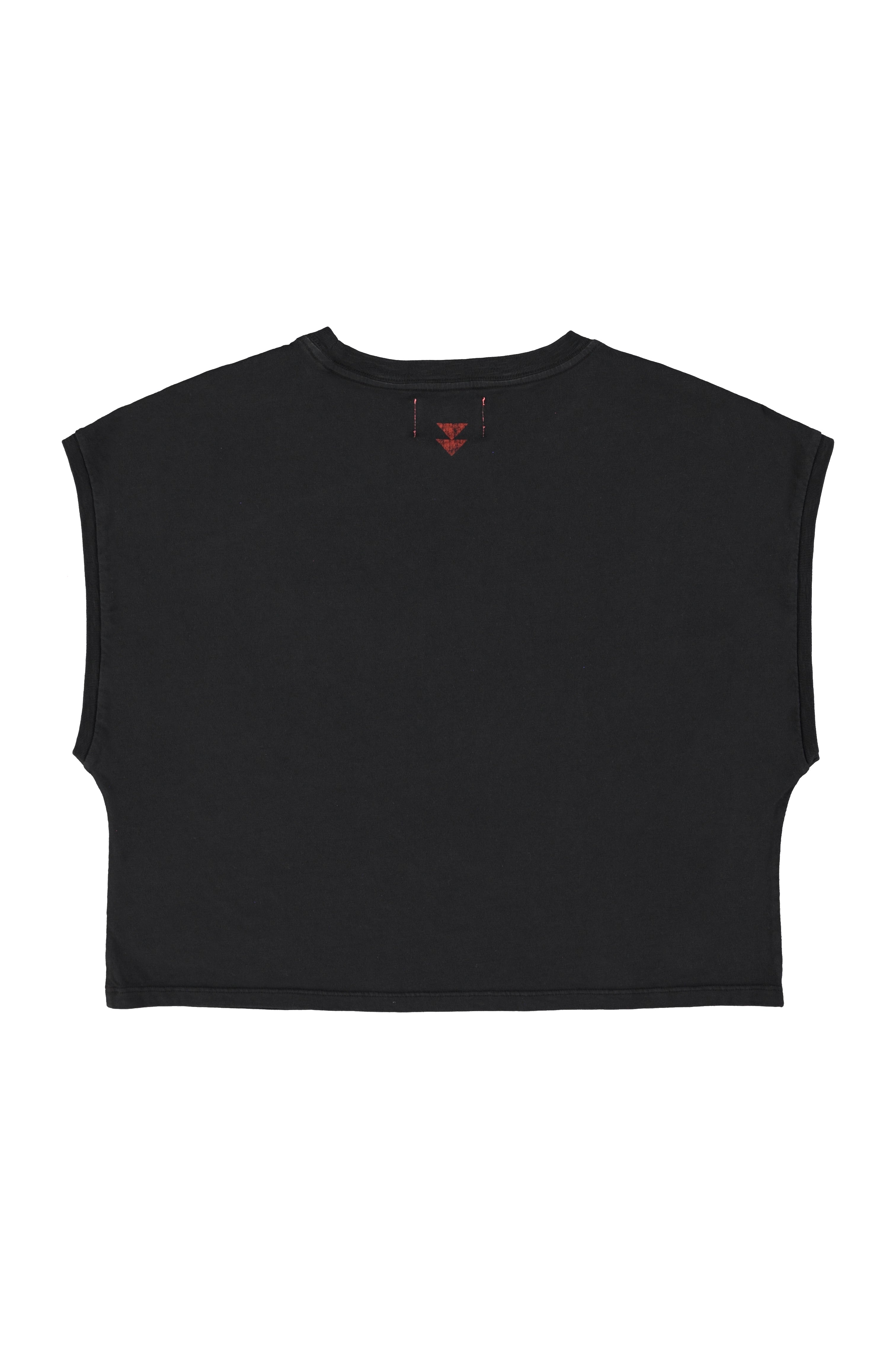 This sleeveless top made from cotton flamé offers a casual and stylish look. Featuring a round neck and ribbed hems, it ensures comfortable wear. The striking dancer print on the front adds a playful touch to the top.