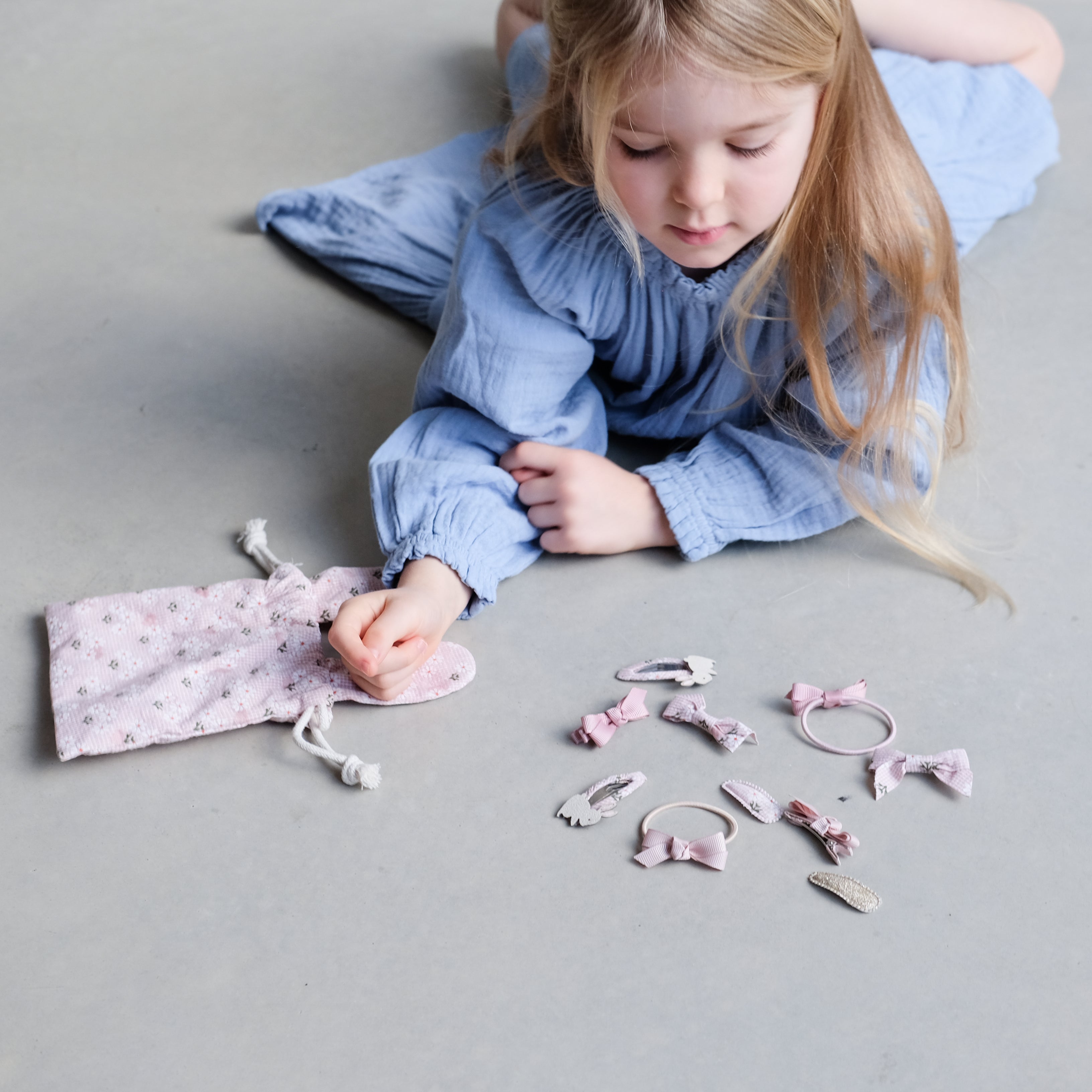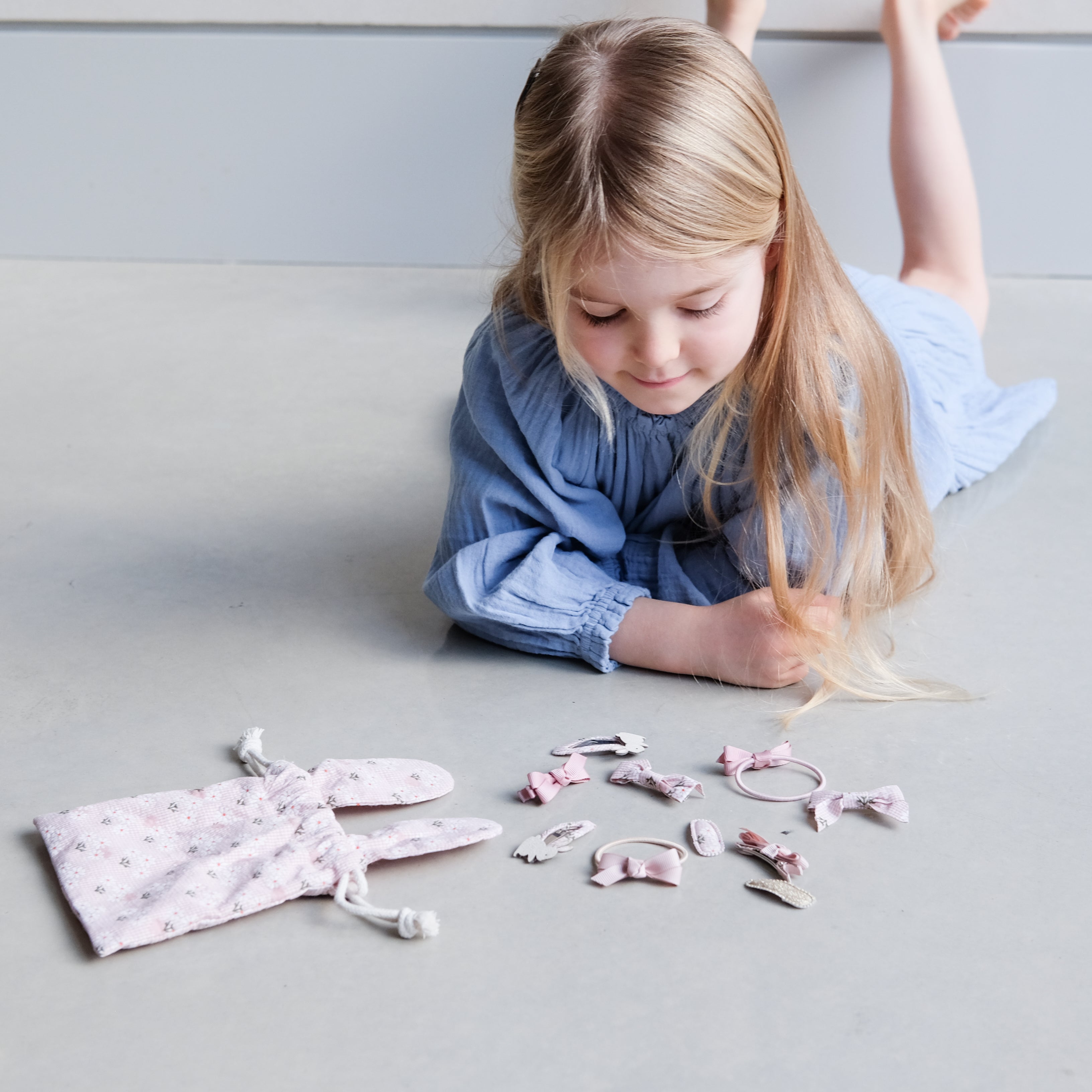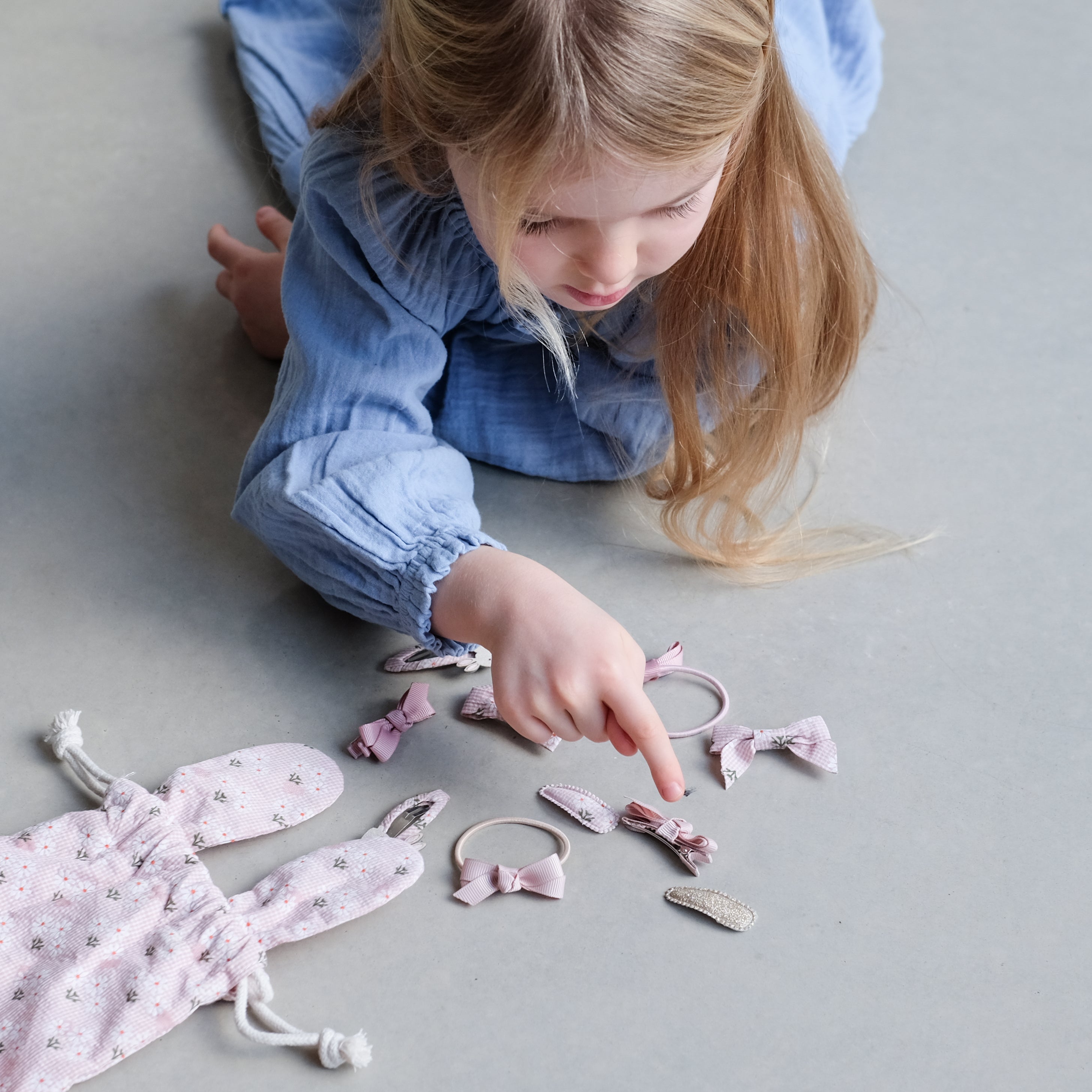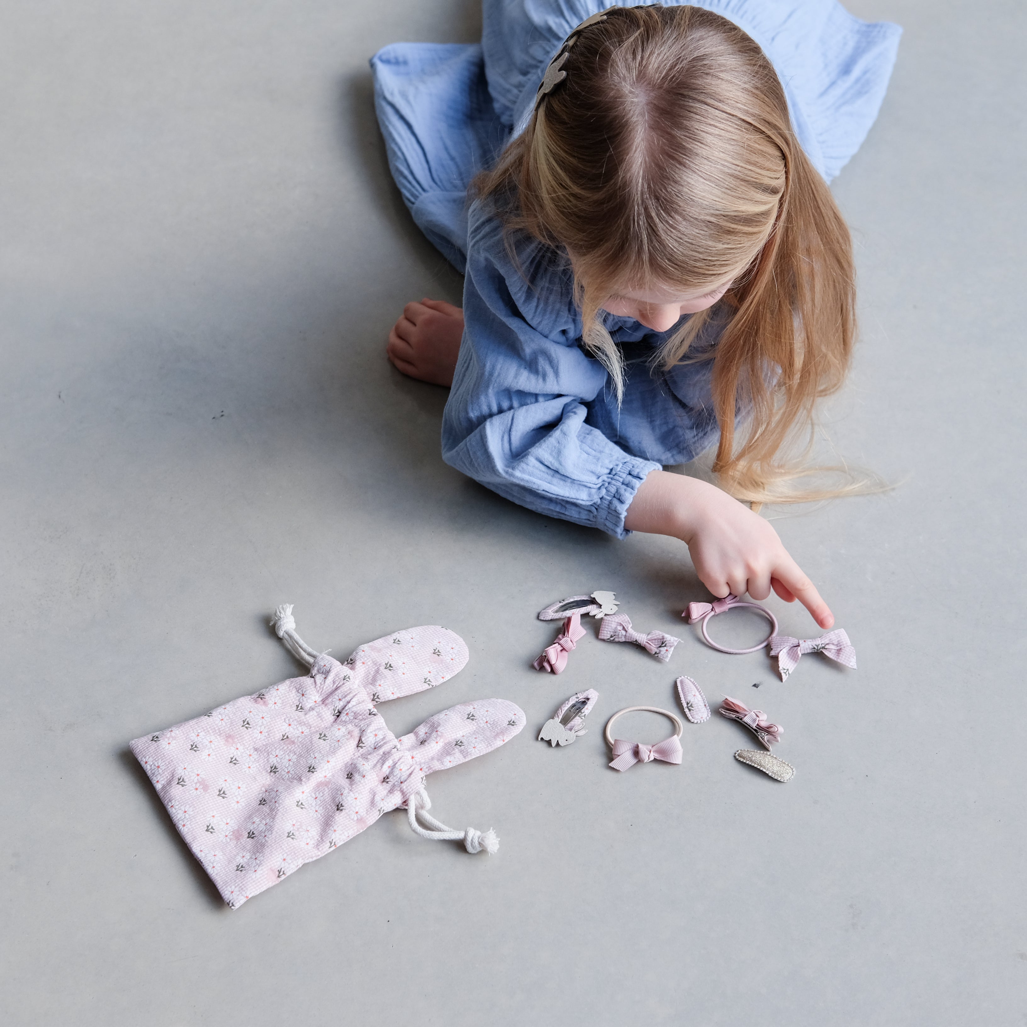 Der Beutel enthält 10 Haaraccessoires, darunter 8 verschiedene Clips und 2 Schleifen-Ponys. Der Hasenbeutel ist aus einem floralen Stoff mit Kordelzug gefertigt und bietet eine stilvolle Aufbewahrungslösung.