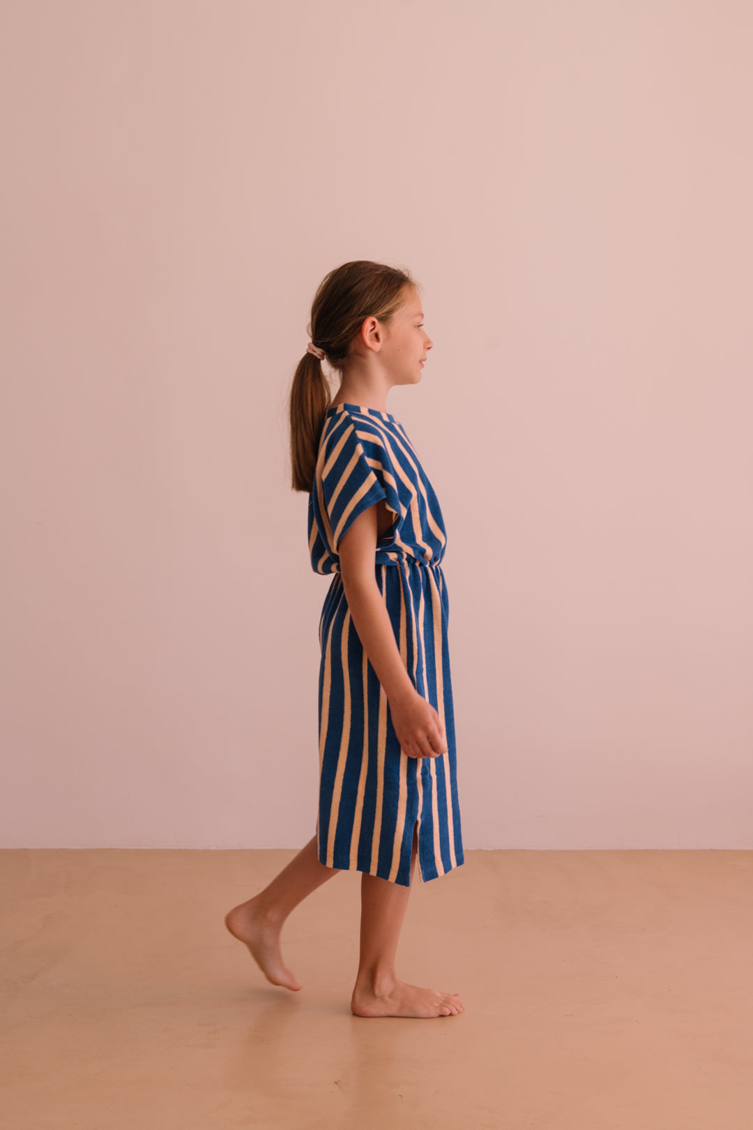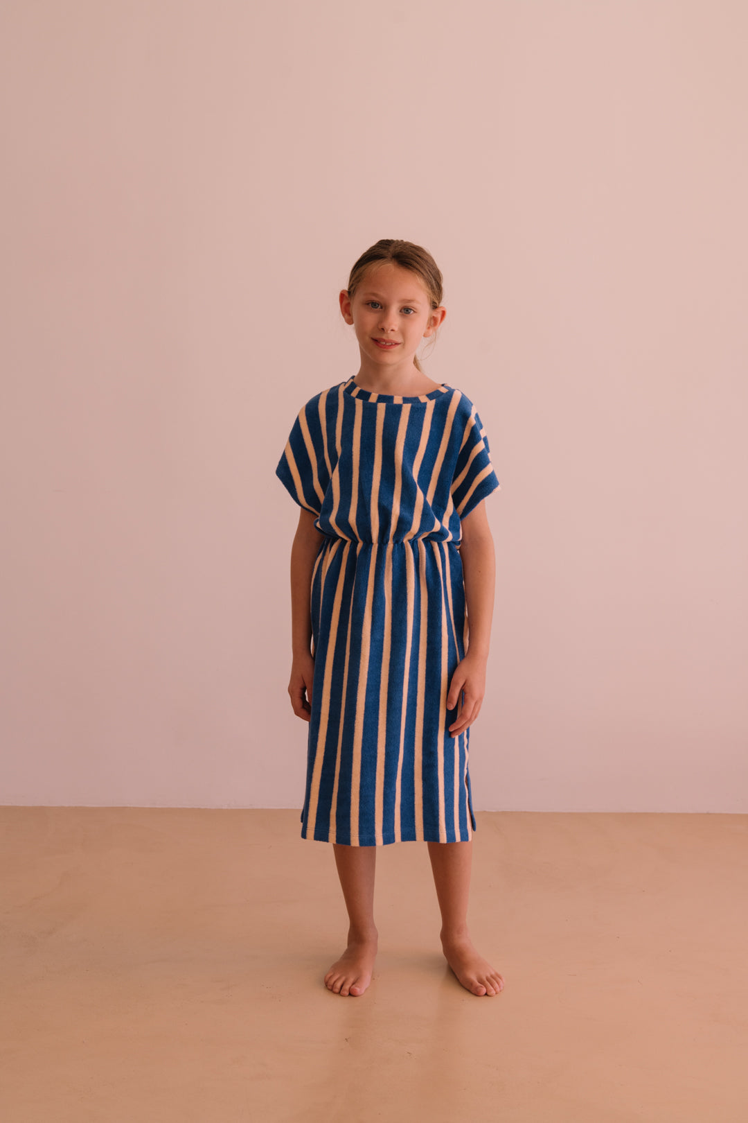 Die einzigartigen Streifen und die elastische Taille machen dieses Kleid zu einem idealen Begleiter für jeden Anlass. Es ist leicht zu pflegen und behält seine Form auch nach vielen Wäschen, was es zu einer großartigen Ergänzung für die Garderobe deines Kindes macht.